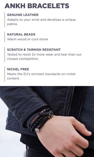 Valkājiet to vienu pašu vai kopā ar citām rokassprādzēm. Rokassprādze cieši pieguļ plaukstas locītavai. Matētās krelles un ādas siksna rada sabalansētu, dabisku izskatu. Ankh diski pievieno smalku akcentu, nepārspīlējot dizainu. Rokassprādze der gan ikdienas, gan pusformālam apģērbam.